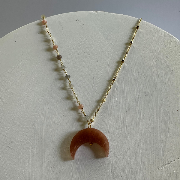 Enhanced with the mystical energy of Rainbow Moonstone, the soothing presence of Rose Quartz, or the captivating charm of Amethyst, each asymmetrical gemstone necklace radiates a unique energy that aligns with the qualities of these crystals.